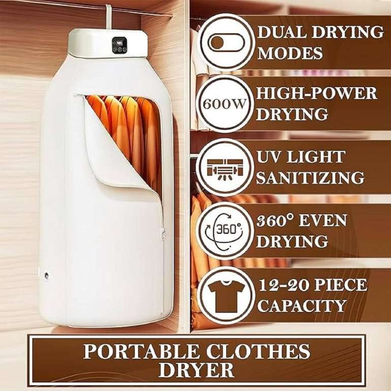 Fast Drying & 2 Modes: This 600W, 110V portable dryer swiftly dries your clothes with powerful airflow and heat. Bid farewell to damp garments. Its gentle mode (40-50°C warm air) suits delicate fabrics, while the hot air mode (50-60°C) quickly dries cotton, linen, nylon, and polyester. Dry up to 8 thin garments at once. Timer Function: Use the 1H/2H/8H timer function to set your preferred drying time, allowing you to focus on other tasks while your laundry dries perfectly. Efficient & Space Saving: Measuring 8.7 x 3.9 x 11.4 inches, this compact and portable dryer is ideal for small living spaces like apartments, dorms, RVs, or travel. Its space-saving features allow easy storage when not in use, maximizing limited space.